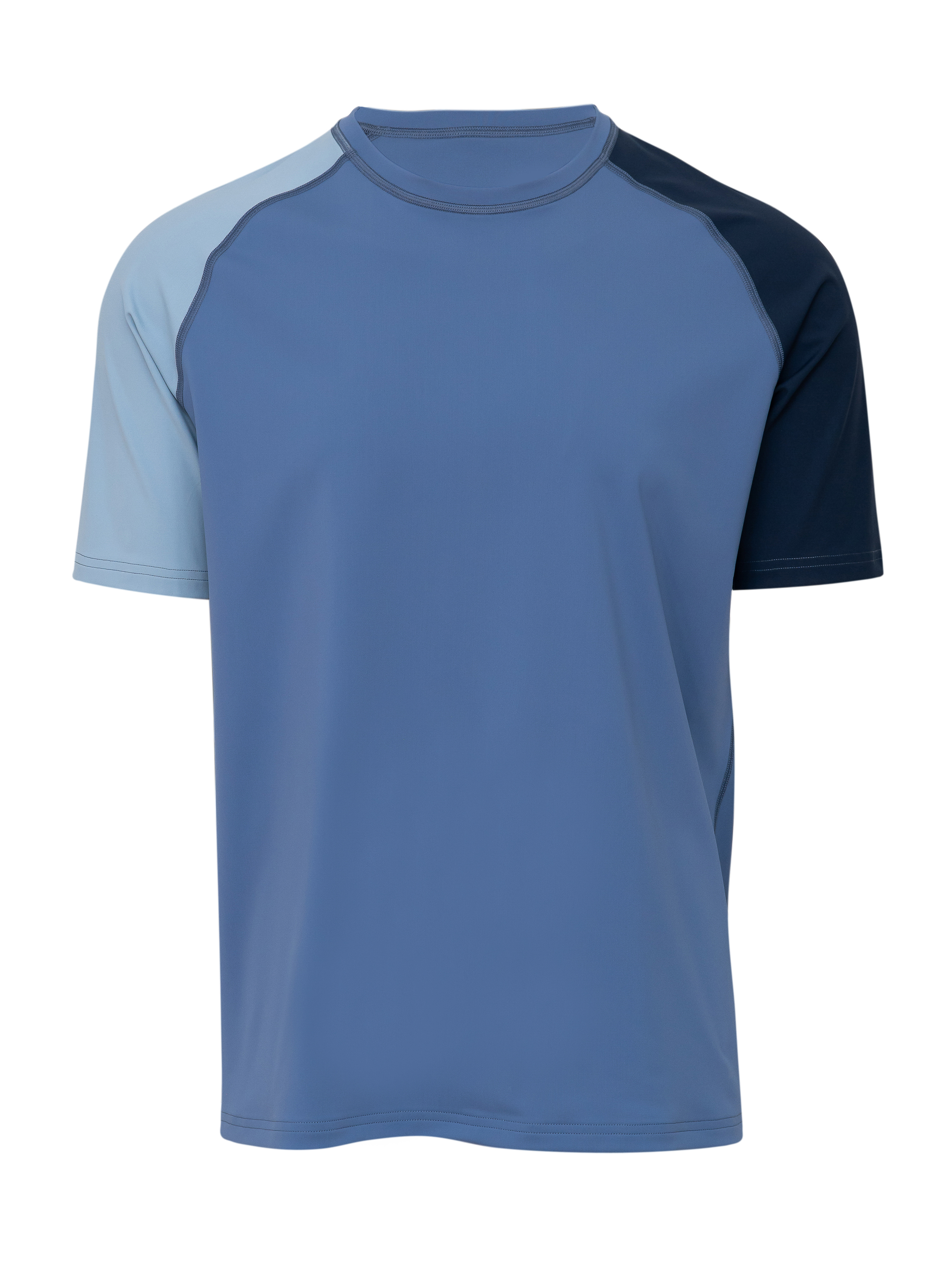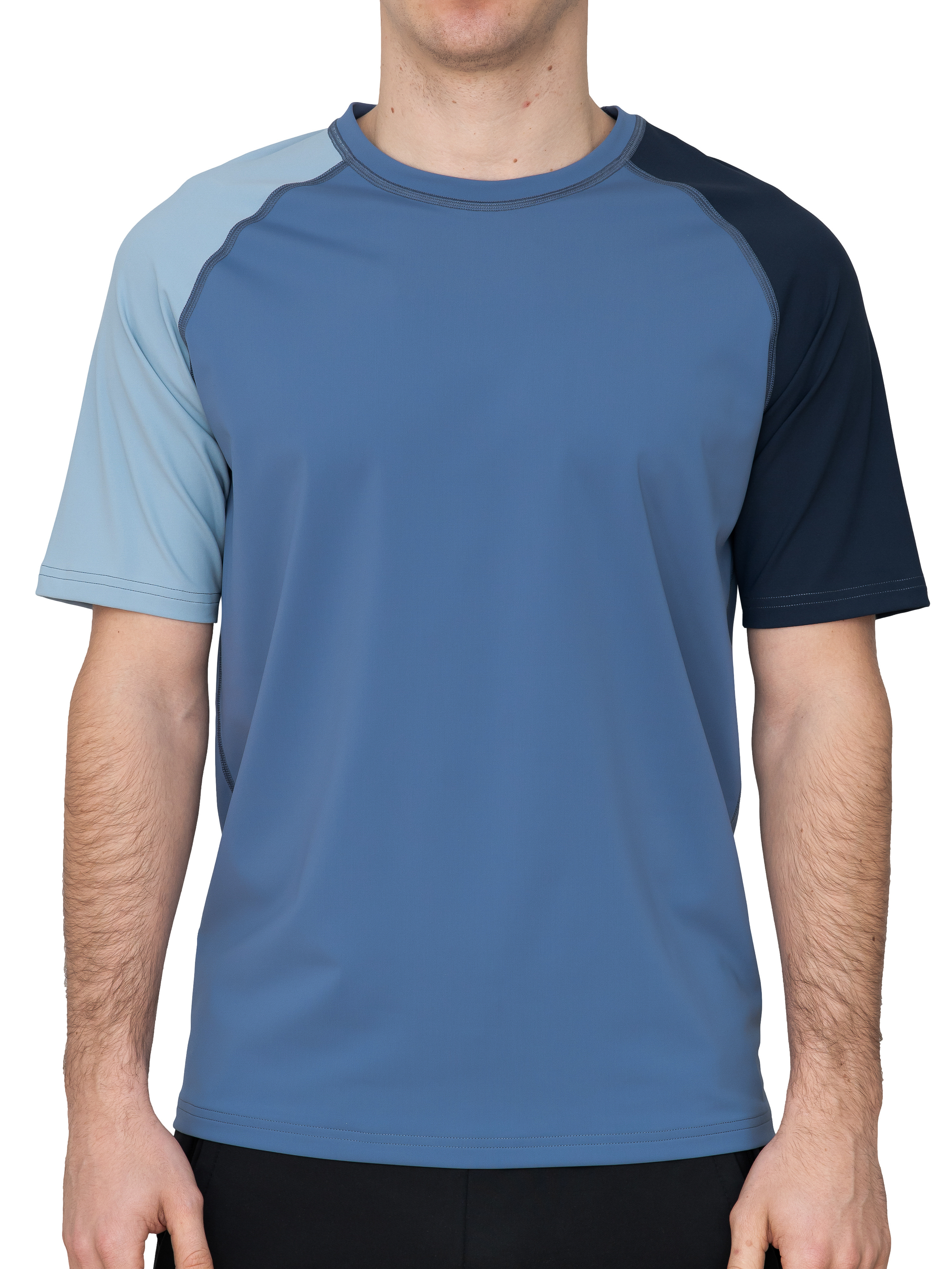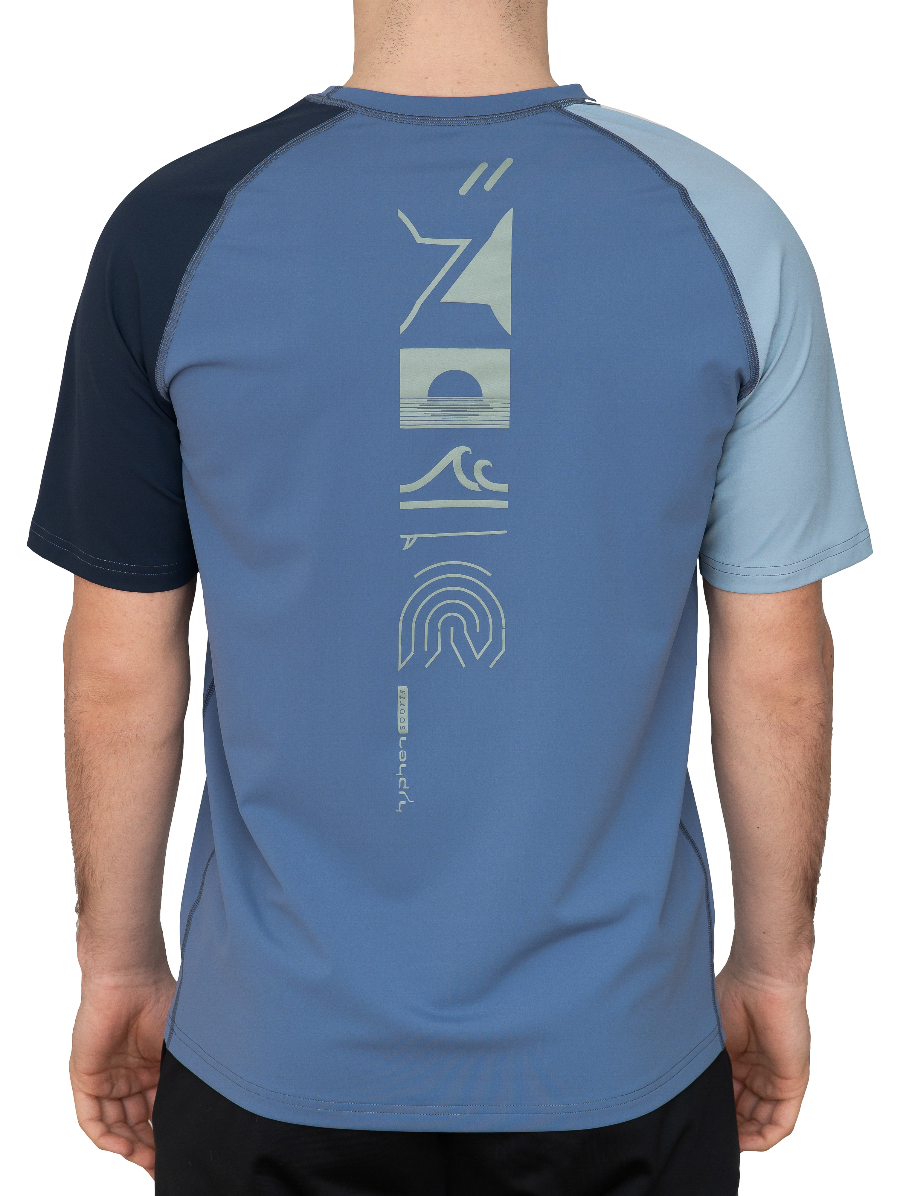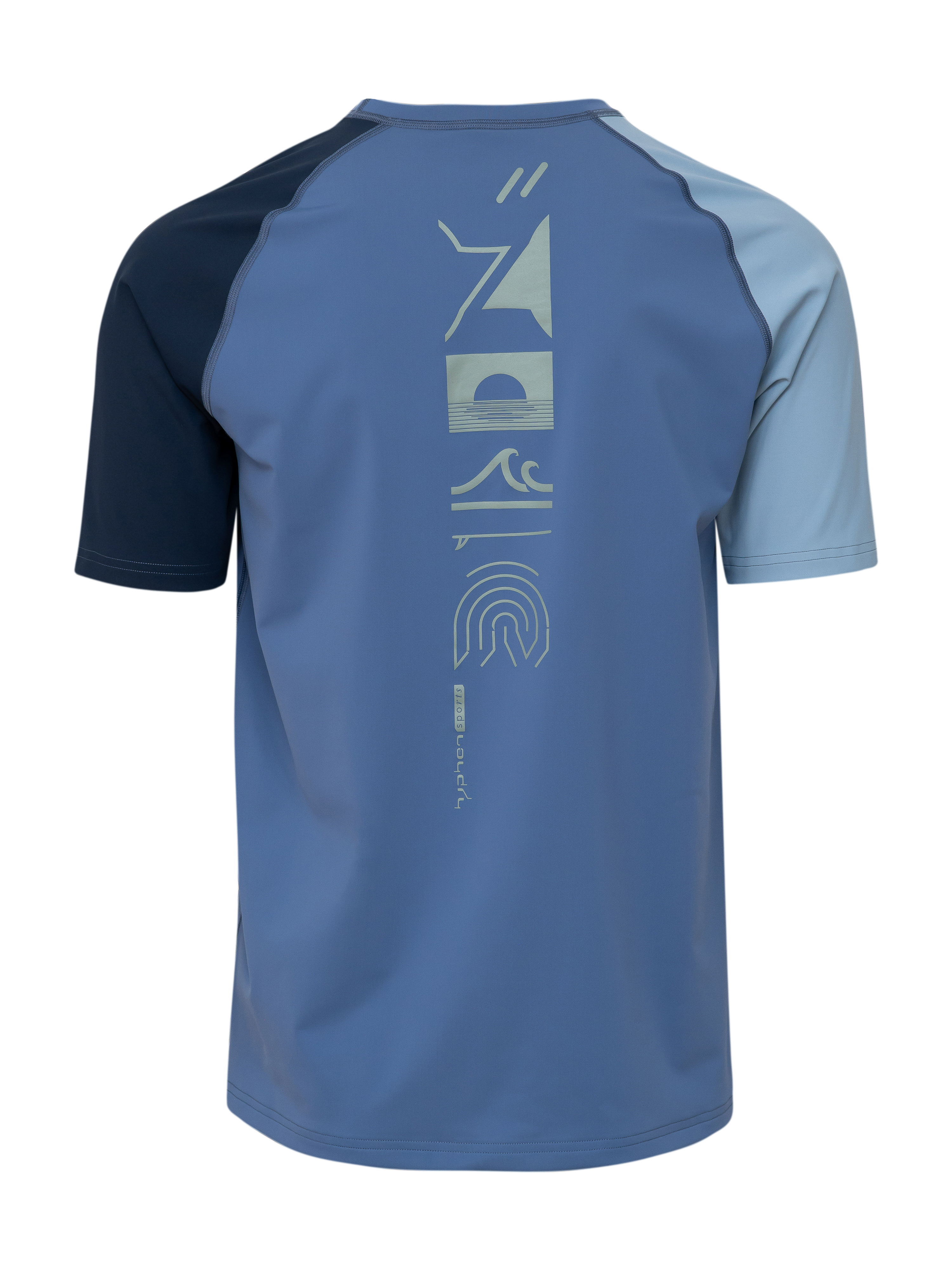 Asymetrisch verteilte Blautöne und das Grafikdesign auf dem Rücken verbinden bei diesem Shirt Design und Funktion