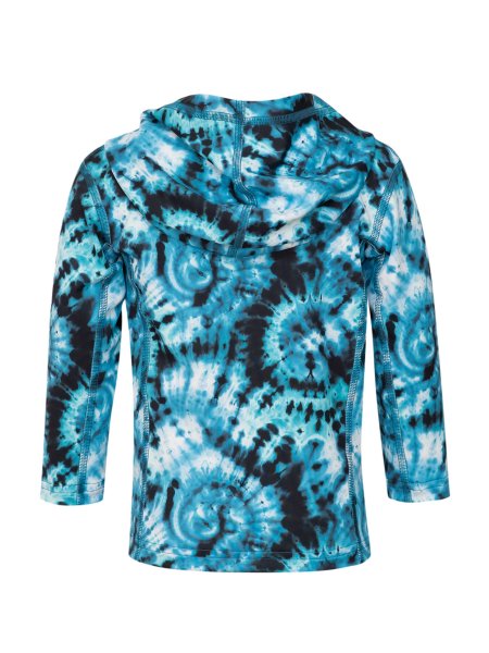 Pfiffige Baby UV Kapuzenjacke mit Batikdruck in türkis und schwarz.
